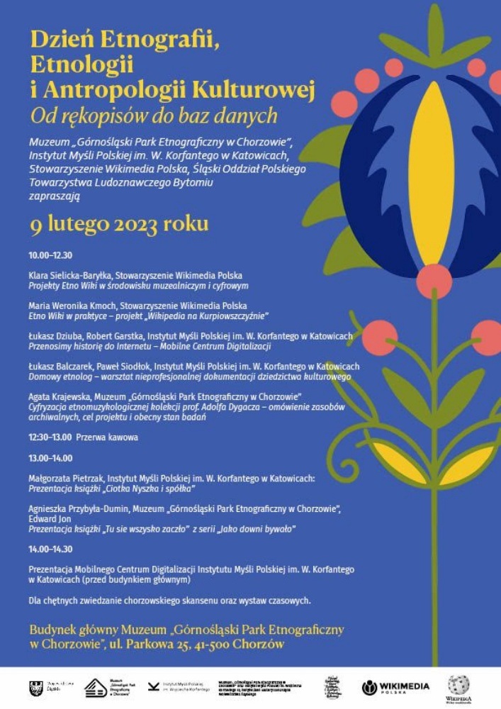Podczas chorzowskiej konferencji z okazji Dnia Etnografa w Muzeum "Górnośląski Park Etnograficzny w Chorzowie" zaprezentowane zostaną przykłady zbiorów cyfrowych jak i publikacje popularyzatorskie i naukowe wydawane w sposób tradycyjny. O projektach cyfrowych związanych z etnografią i etnologią mówić będą m.in. przedstawicielki Projektu EtnoWiki.